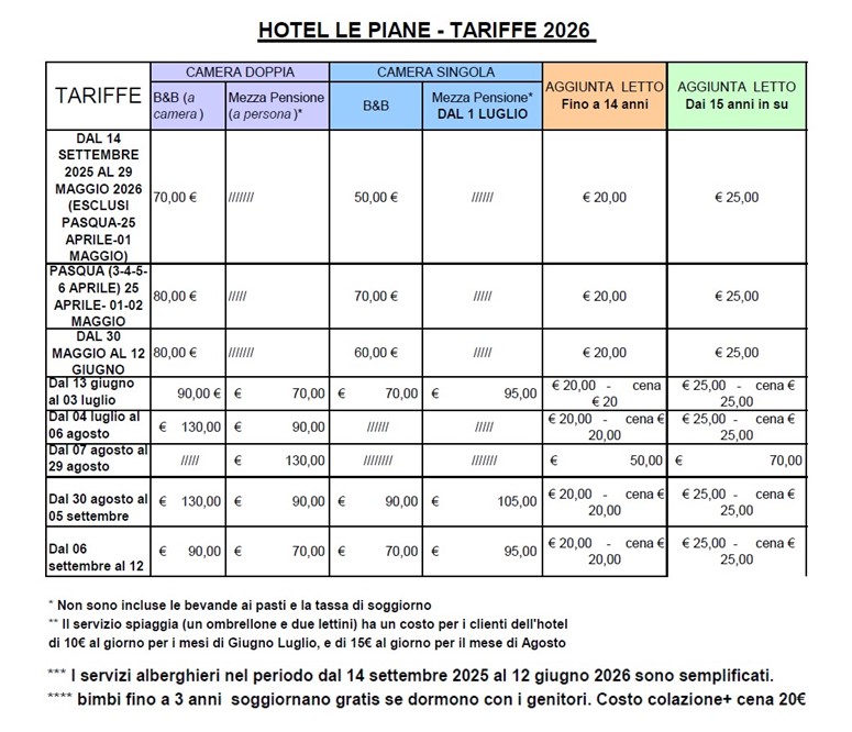 HOTEL LE PIANE – TARIFFE 2026